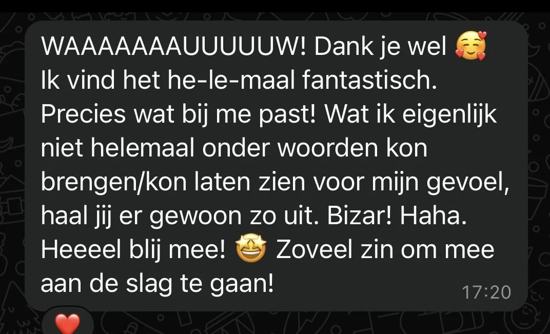Ik zie waar jouw verhaal kracht verliest, waar je uitstraling niet matcht met je potentieel en waar je jezelf klein houdt. De vrouwen die bij mij komen, weten wat ze willen. Ik hoef ze niet te overtuigen. Ze voelen al langer dat hun potentieel groter is dan wat ze nu laten zien. Ze willen hun eigen stem laten horen. Vandaag, niet morgen. De tijd die we vandaag hebben, komt nooit meer terug.