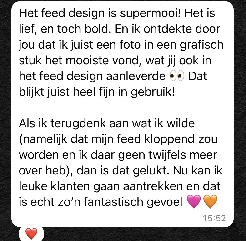 Je ontvangt een esthetische voorbeeld feed en praktische tips om jouw stijl en verhaal zelf door te voeren, zodat je Instagram continuïteit en herkenbaarheid uitstraalt, ook na het traject.