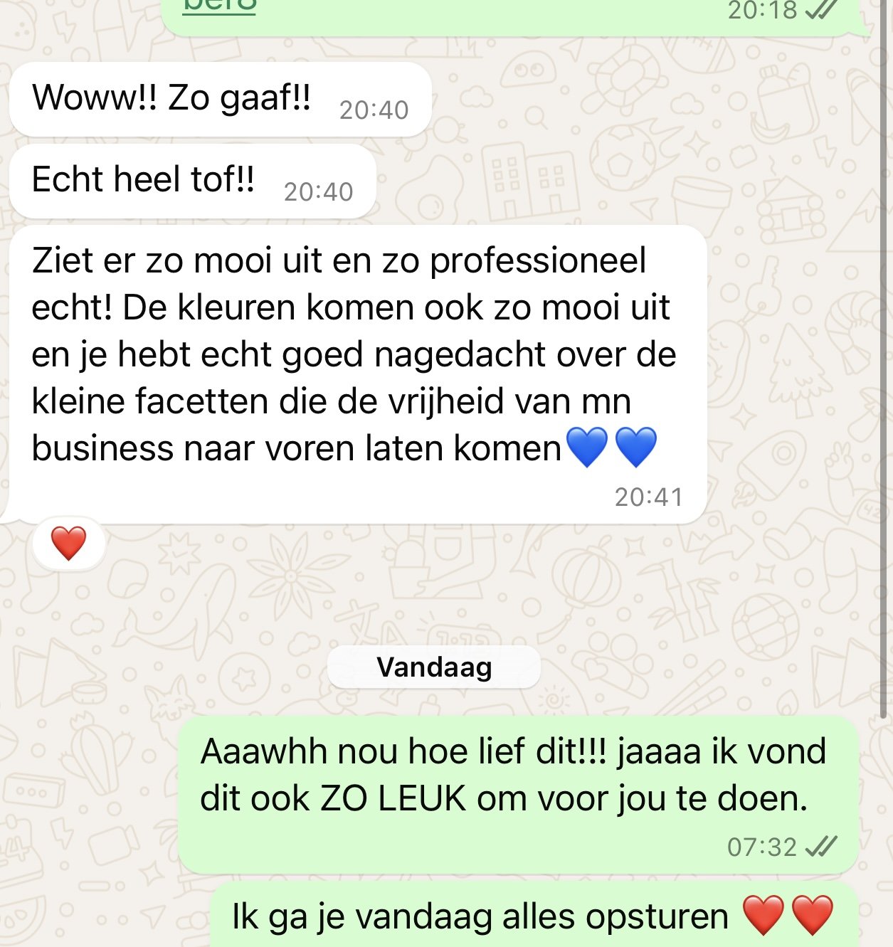 Dan is Brand Design waarschijnlijk een betere keuze. In dat traject creëren we een volledige branding of rebrand die past bij jouw volgende fase in je business.